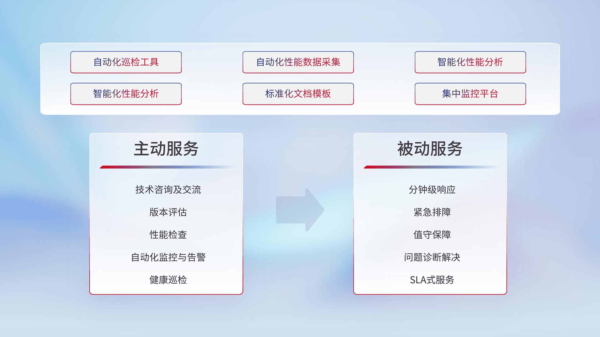 智能化工具和标准化文档,,保障服务质量,,,提供主动服务(包含技术咨询、、、版本评估、、、性能检查、、、自动化监控与告警、、健康巡检)和被动服务包含(分钟级响应、、、紧急排障、、、值守保障、、问题诊断解决、、SLA服务)。。