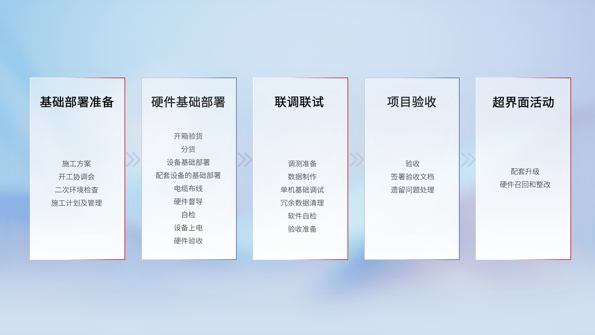 从基础部署准备、、、、硬件基础部署、、、联调联试、、项目验收、、、、越界面活动的全过程可追溯,,,保证施工质量和进度。。。。